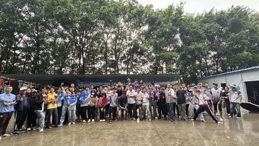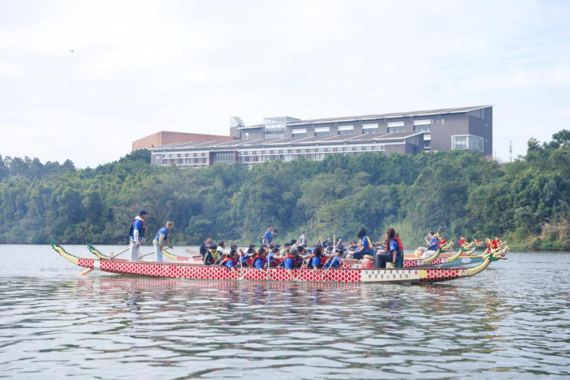 2025 年 12 月 2 日,广东轻工职业技术大学南海校区北区龙舟湖畔,一场别开生面的龙舟竞渡比赛在此激烈展开,为校园体育文化节增添了浓墨重彩的一笔。尽管天空阴雨连绵,但丝毫未能阻挡同学们的热情。湖面上,我校7个学院的近120 名学生齐聚一起,他们身着各色队服,分坐在龙舟之上,宛如一条条蓄势待发的蛟龙。随着一声令下,龙舟如离弦之箭,划破湖面,水花四溅。队员们手持船桨,动作整齐划一,有力地划动着,他们口中喊着口号,节奏感十足,展现出顽强拼搏、团结协作的精神风貌。